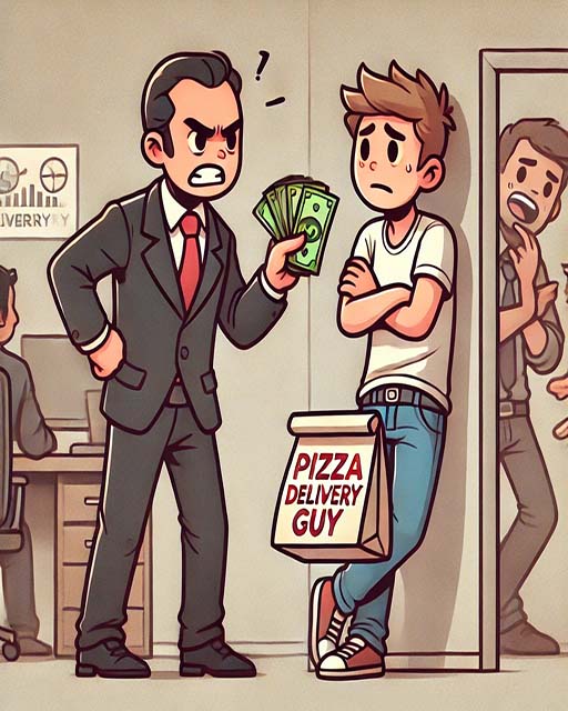 With a sheepish grin, one of the other workers mutters, ”Pizza delivery guy.”