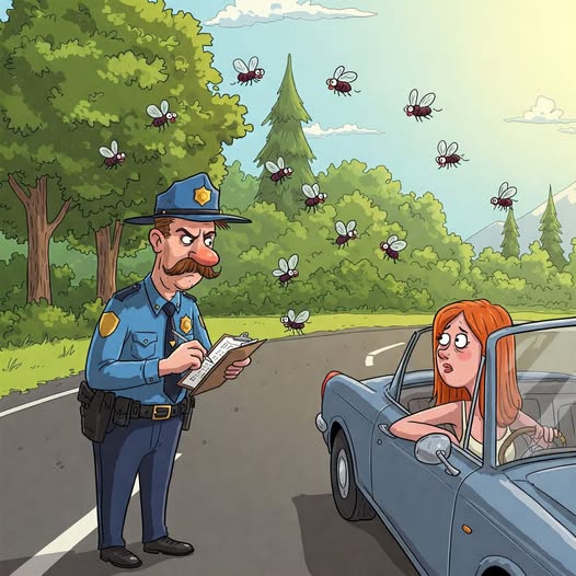 While he’s writing the ticket, flies keep buzzing around his head, annoying him considerably.