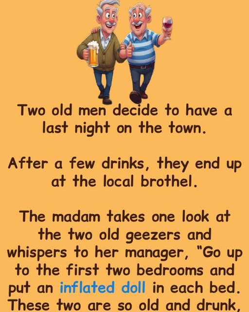 The madam takes one look at the two old geezers and whispers to her manager, “Go up to the first two bedrooms and put an inflated doll in each bed. These two are so old and drunk, I’m not wasting two of my girls on them. They won’t know the difference.”