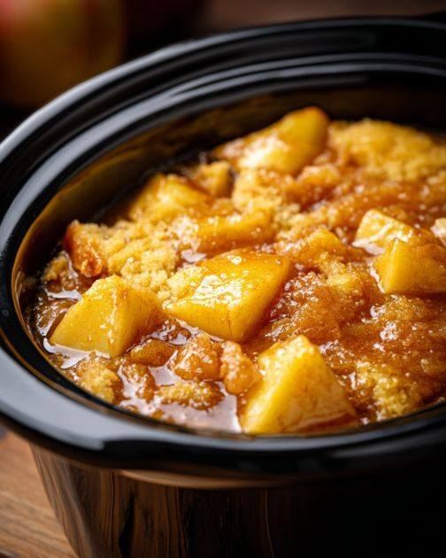 This simple slow-cooker dessert combines apple pie filling, dry cake mix, and melted butter to create a cozy, cobbler-like apple cake with minimal effort.
