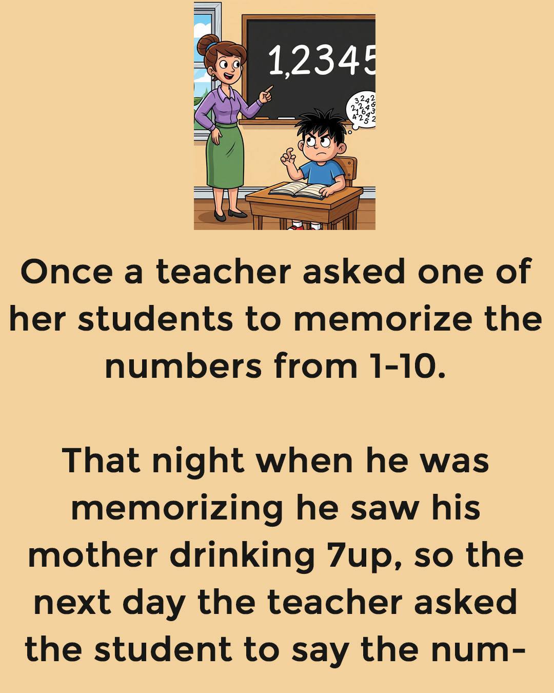 That night when he was memorizing he saw his mother drinking 7up, so the next day the teacher asked the student to say the numbers that he memorized he replied,” 1-2-3-4-5-6-8-9-10″.