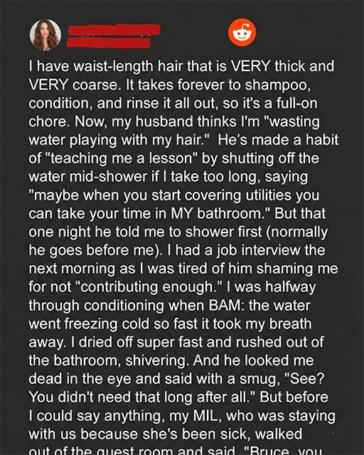 “Just water?” I was shaking, soaked, humiliated. “You turned off the hot water while I had conditioner in my hair!”