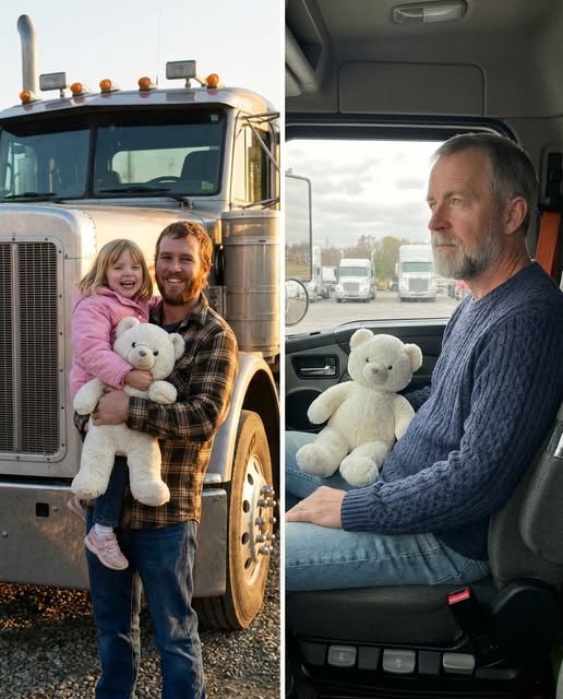 Snow — that’s what Emily named him — became part of our ritual. Every time I left for a long trucking haul, she insisted I buckle him into the passenger seat. “He’ll protect you,” she’d say, dead serious, arms crossed like a tiny supervisor. Even when she grew older and pretended she’d outgrown the tradition, she still handed Snow to me quietly before every trip. Life at home grew complicated over the years — her mom and I drifted apart, and eventually divorced — but that bear remained a steady presence. Then cancer entered our lives, and hospital rooms replaced truck stops. Emily carried Snow to treatments and cracked jokes with nurses, determined to stay brave. Two weeks after she made me promise to “keep driving,” she was gone.