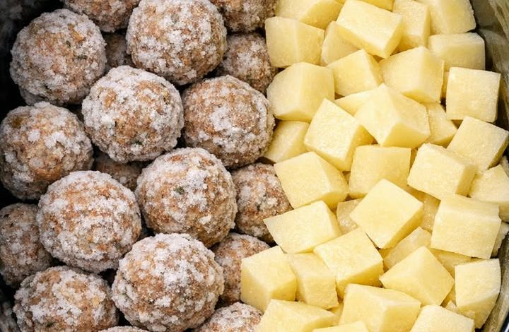 Place the frozen meatballs over the potatoes. There’s no need to thaw them first—adding them frozen helps maintain their texture during cooking.