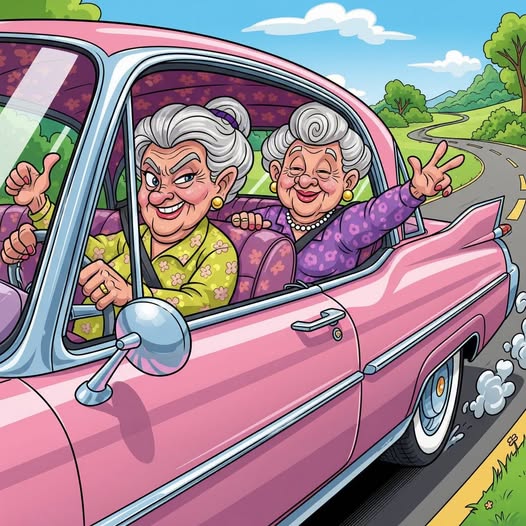 Two elderly women were out driving in a big car. Both could barely see over the dashboard.